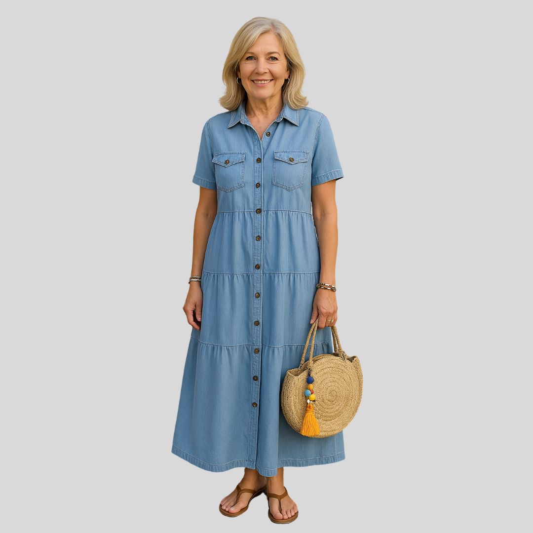 🔹 Tipas: Džinsinė midi suknelė su mygtukais